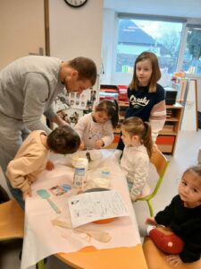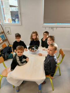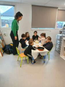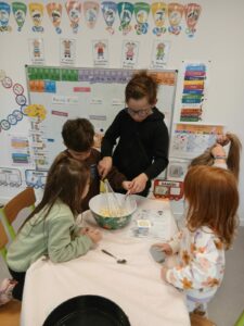 Chaque mois, tous les enfants de maternelle ainsi que les élèves de l’école dont c’est l’anniversaire participent à un atelier cuisine commun. Ces temps partagés permettent de créer du lien entre les classes et de vivre des moments de coopération et de convivialité.